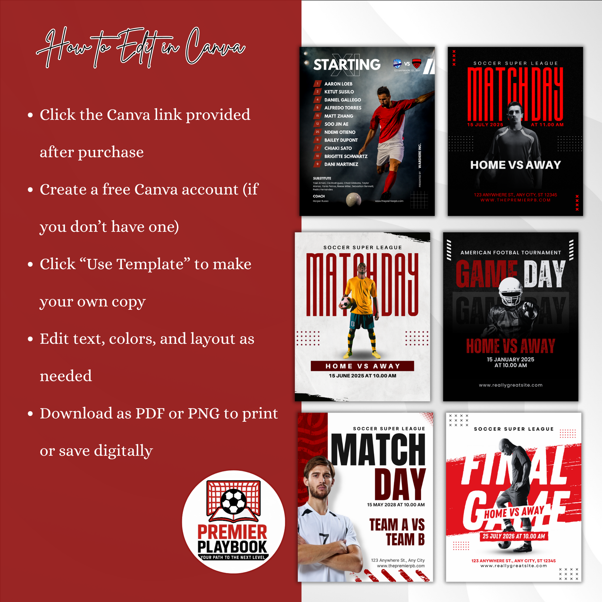 This Editable Match Day Instagram Post template is perfect for student-athletes, club teams, or parents managing athlete profiles. It's fully customizable in Canva, so you can update team name, date, opponent, location, and more—in minutes.
