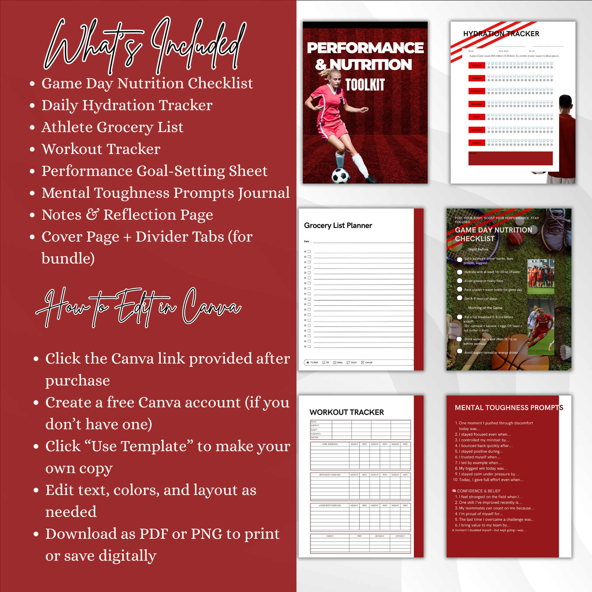 This all-in-one Performance & Nutrition Toolkit is built for student-athletes and parents navigating the college recruiting journey. From game-day prep to everyday mental focus, these printable tools help athletes stay strong, sharp, and consistent on and off the field.
